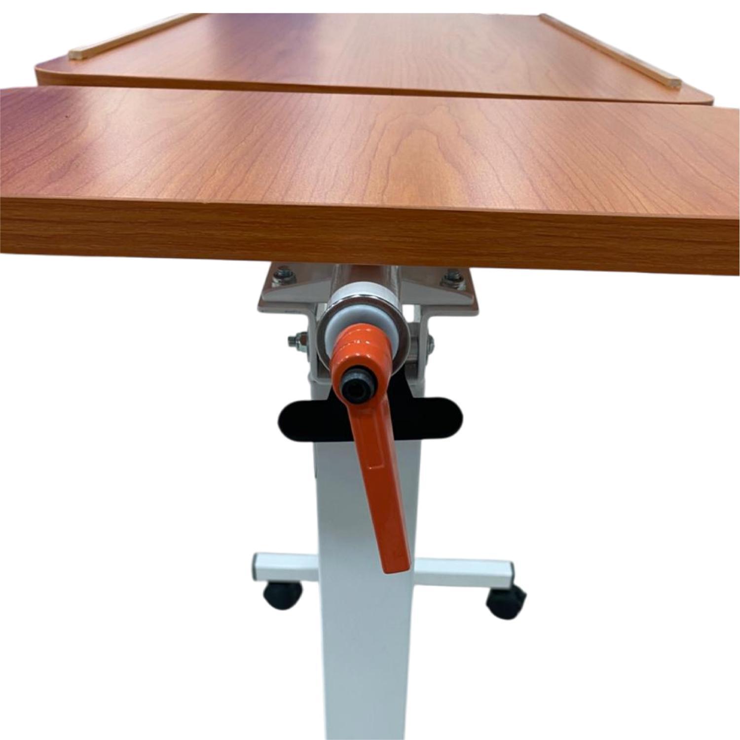 Este modelo incluye un listón adicional, que otorga soporte extra y puede cumplir diversas funciones según el uso que se le dé. Gracias a su sistema de alzamiento con resorte de gas y superficie inclinable en cualquier dirección, la mesa se ajusta con suavidad y precisión a la posición deseada.
